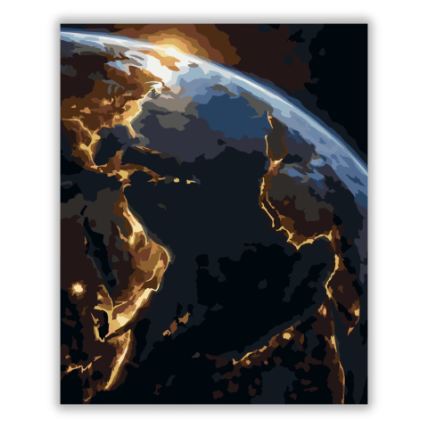Föld Napfelkeltében - számfestő készlet – 40×50 cm (Keret nélkül) A festmény a Földet ábrázolja az űrből nézve, amint a napfény aranyló ívben ragyog a bolygó peremén. A kép színvilága arany, kék és fekete árnyalatokkal játszik, kiemelve a városok fényét é
