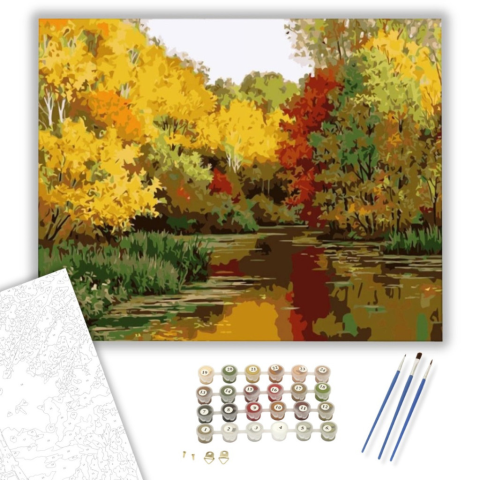 Folyó az erdőben - számfestő készlet – 40×50 cm (Keretre feszítve) Az őszi erdő csendje és nyugalma árad ebből a festményből, mintha egy varázslatos világba vezetne minket. A színek kavalkádja mesél a természet változásairól, miközben a folyó tükrében meg