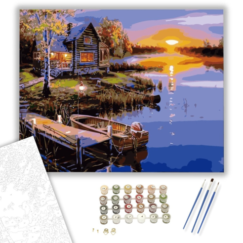 Folyóparti Ház - számfestő készlet – 40×50 cm (Keretre feszítve) A festmény meleg, meghitt hangulatot áraszt, amely a természet nyugalmát idézi. Egy eldugott folyóparti ház történetét meséli el, ahol a naplemente fényei aranyló ragyogásba borítják a tájat
