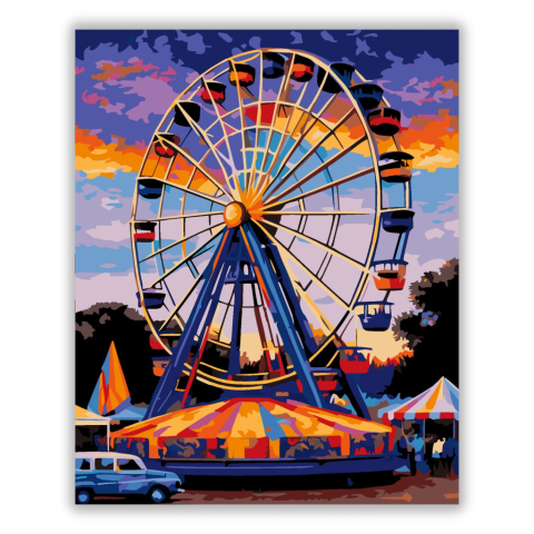 Forgókerék Színkavalkádja - számfestő készlet – 40×50 cm (Keret nélkül) A kép egy vidámpark forgókerekét ábrázolja, amely életteli színekben tündököl. A vibráló árnyalatok és lendületes ecsetvonások dinamikus kompozíciót teremtenek, amely magával ragadja
