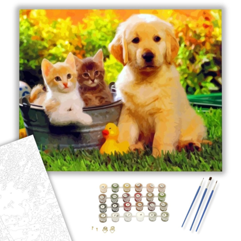 Fotó a kertben - számfestő készlet – 40×50 cm (Keretre feszítve) Ez a festmény egy vidám és barátságos hangulatot áraszt, amely azonnal mosolyt csal az arcodra. A kép története egy nyugodt délutánról mesél, ahol az állatok békésen pihennek a kertben. A me