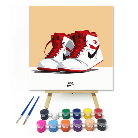 Friss és stílusos - gyerek számfestő készlet – 20×20 cm (Keretre feszítve) Ez a kép egy menő sportcipőt ábrázol, amely piros és fehér színeivel igazán friss és stílusos megjelenést kölcsönöz. A színes festékekkel és ecsetekkel a gyerekek könnyedén életre