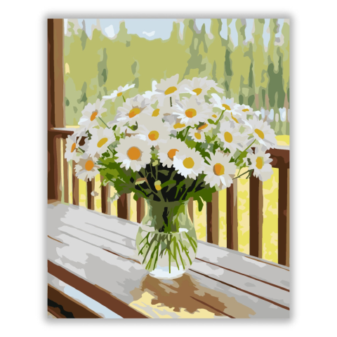 Friss Margaréták a Teraszon - számfestő készlet – 40×50 cm (Keret nélkül) A festmény egy fa terasz asztalán elhelyezett üveg vázában lévő frissen szedett margarétákat ábrázol. A fehér szirmok és sárga középrész vidám, napos összhangot teremtenek, miközben