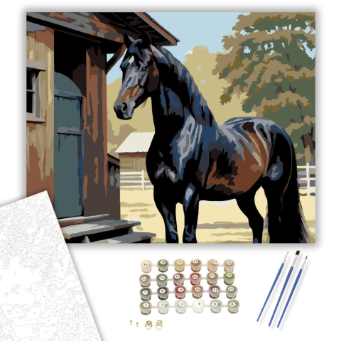 Fríz Ló az Istállónál - számfestő készlet – 40×50 cm (Keretre feszítve) A festmény egy elegáns fekete fríz lovat ábrázol, amint egy régi fa istálló előtt áll. A ló sörénye és farka lágyan lebeg a szélben. A kép meleg barna és zöld árnyalatokkal van megfes