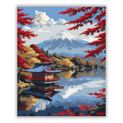 Fuji Hegy Őszi Tóparttal - számfestő készlet – 40×50 cm (Keret nélkül) A festmény a Fuji hegyet ábrázolja kora ősszel, vörös juharlevelek keretében, egy csendes tóparti falucskával. A kép színvilága a piros, sárga és kék árnyalatainak harmonikus kontraszt