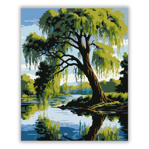 Fűzfa a Nyugodt Folyó Partján - számfestő készlet – 40×50 cm (Keret nélkül) A festmény egy nagy fűzfát ábrázol, amely hosszú, hajló ágakkal áll a nyugodt folyó partján, tükröződése finoman fodrozódik a víz felszínén. A zöld lombkorona és a kék ég harmóniá