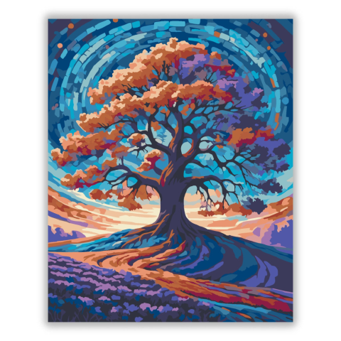 Galaktikus Színkavalkád és Varázslatos Fa - számfestő készlet – 40×50 cm (Keret nélkül) A festmény egy varázslatos fát ábrázol, amely egy színekben gazdag mező közepén áll, ahol a talaj galaxisokba olvad. A kompozíció mély kék, lila, narancs és puha türki