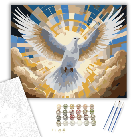 Galamb Olajággal - számfestő készlet – 40×50 cm (Keretre feszítve) A festmény egy galambot ábrázol, amely az égből ereszkedik alá, olajágat tartva a csőrében. A kompozíció fehér és arany ecsetvonásokkal ragyog, meleg fényt árasztva. A kép a béke és a remé