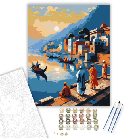 Gangesz Folyó Hajnalban - számfestő készlet – 40×50 cm (Keretre feszítve) A festmény a Gangesz folyót ábrázolja napfelkeltekor, ahol papok szertartásokat végeznek a ghátokon. A kép meleg narancs és kék árnyalatokban pompázik, harmonikus és nyugodt hangula