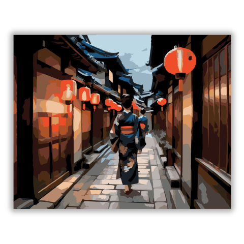 Gion Esti Utcája Geishákkal - számfestő készlet – 40×50 cm (Keret nélkül) A festmény Kiotó Gion negyedének szűk utcáját ábrázolja alkonyatkor, ahol két elegáns kimonót viselő gésa sétál. A vörös lámpások és a fa homlokzatok meleg fényei kontrasztot alkotn