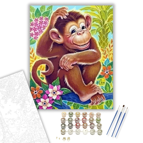 Gondolkodó kismajom - számfestő készlet – 40×50 cm (Keretre feszítve) Ez a festmény vidám és játékos hangulatot áraszt, amely azonnal mosolyt csal az arcodra. A kismajom kíváncsisága és bája egy trópusi kaland ígéretét hordozza magában. Az élénk színek és