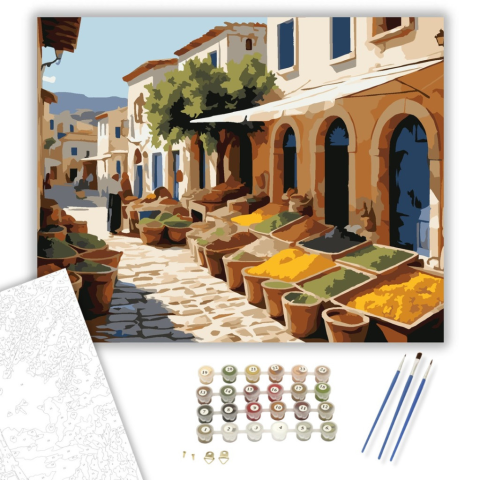 Görög Falu Piaca - számfestő készlet – 40×50 cm (Keretre feszítve) A festmény egy napsütötte görög falu piacterét ábrázolja, ahol standok kínálják az olívabogyókat, fűszernövényeket és kézműves kerámiákat. Az élénk színek, mint a zöldek, sárgák és pirosak