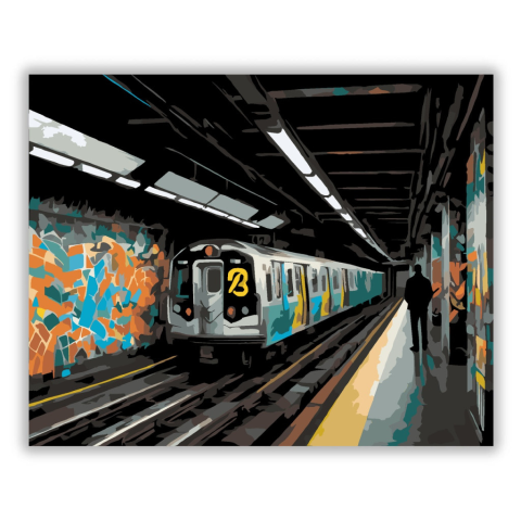 Graffitivel Díszített Metró Az Aluljáróban - számfestő készlet – 40×50 cm (Keret nélkül) A festmény egy városi metrókocsit ábrázol, amint megérkezik egy földalatti peronra, színes graffitikkel díszítve. A hideg fényű fluoreszkáló lámpák és a színes falfes
