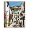 Granadai Utca és Alhambra - számfestő készlet – 40×50 cm (Keret nélkül) A festmény egy csendes granadai utcát ábrázol, fehér házakkal és virágokkal teli erkélyekkel, háttérben az Alhambrával. A kép világos kék ég alatt játszódik, a fehér épületek és a zöl