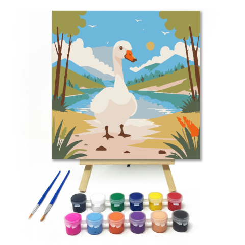 Gúnár - gyerek számfestő készlet – 20×20 cm (Keretre feszítve) Ez a bájos kép egy kedves gúnárt ábrázol, aki vidáman sétál a festői tóparton. A ragyogó kék ég és a zöldellő hegyek mesés kalandra hívnak. Tökéletes választás a gyerekek első festői utazásáho