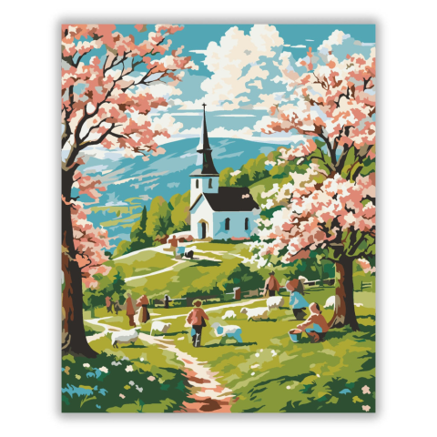 Gyermekek Húsvéti Kalandja a Templom Kertjében - számfestő készlet – 40×50 cm (Keret nélkül) A festmény egy vidéki tájat ábrázol, ahol egy kis kápolna, virágzó fák és gyerekek húsvéti tojásokat rejtenek el bárányok mellett. A világos kék és zöld árnyalato