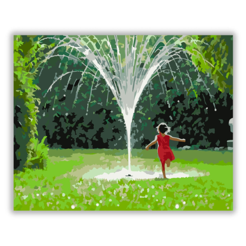 Gyermekjáték a Kerti Szökőkútnál - számfestő készlet – 40×50 cm (Keret nélkül) A festmény egy kerti szökőkútnál játszó gyermeket ábrázol, amint a vízcseppek között szaladgál. A jelenet élénk zöld és friss színekben pompázik, a napsütéses nyári délután han