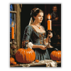 Gyertyafényes hölgy tökökkel - számfestő készlet – 40×50 cm (Keret nélkül) Ez a festmény egy elegáns, régi stílusú ruhába öltözött hölgyet ábrázol, aki egy égő gyertyát tart a kezében. A háttérben tökök és egy rejtélyes portré tűnnek fel, mindezt meleg, l
