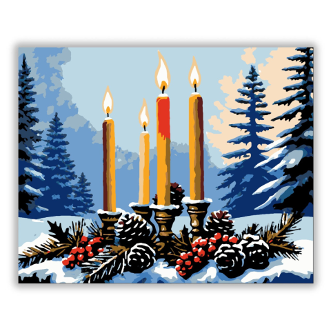 Gyertyafényes Téli Harmónia - számfestő készlet – 40×50 cm (Keret nélkül) A kép középpontjában négy gyertya ég ragyogó fényével, körülöttük fenyőtobozok és piros bogyók kápráztatnak el. A háttérben fenyőfák állnak hópelyhekbe burkolózva, a hűvös kék árnya