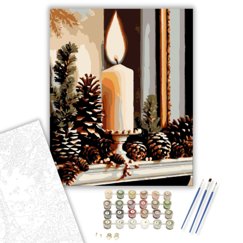 Gyertyafényű Ünnepi Harmónia - számfestő készlet – 40×50 cm (Keretre feszítve) A kép középpontjában egy elegáns gyertya áll, körülvéve fenyőtobozokkal és apró piros bogyókkal, melyek ünnepi hangulatot árasztanak. A háttérben a halvány arany és szürke árny