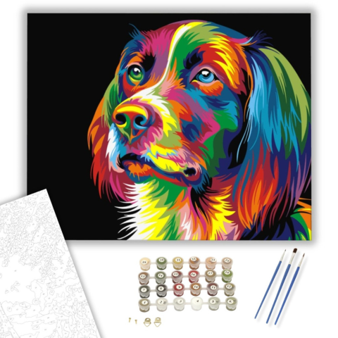 Gyönyörű Kutya - számfestő készlet – 40×50 cm (Keretre feszítve) Ez a festmény élénk és energikus hangulatot áraszt, mintha a színek maguk is táncolni kezdenének a vásznon. A kutya alakja mintha egy történetet mesélne el, amely tele van hűséggel és kívánc