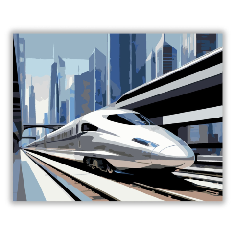 Gyorsvonat Modern Városban - számfestő készlet – 40×50 cm (Keret nélkül) A festmény egy modern, gyorsvonatot ábrázol, amely átszáguld egy városi környezetben, üveg felhőkarcolók között. A kép színvilágát a hideg kék és ezüst árnyalatok határozzák meg, din