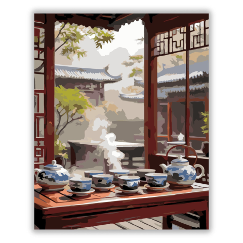 Hagyományos Tea Szertartás Harmóniája - számfestő készlet – 40×50 cm (Keret nélkül) A kép egy hagyományos kínai tea szertartást ábrázol, amely egy fából készült udvarban zajlik, kicsiny agyag teáskannákkal és porcelán csészékkel. A finom színárnyalatok és