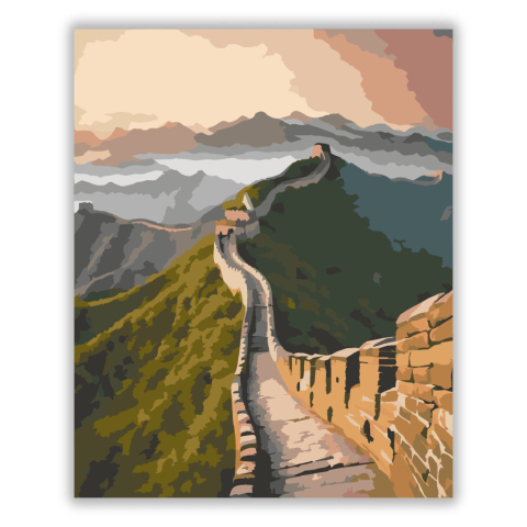 Hajnali Fények a Nagy Falnál - számfestő készlet – 40×50 cm (Keret nélkül) A festmény a Kínai Nagy Falat ábrázolja, ahogy az hajnalban kanyarog a ködös hegyek között. A puha arany fények finoman emelik ki a kőstruktúrákat, míg a részletes ecsetkezelés a t