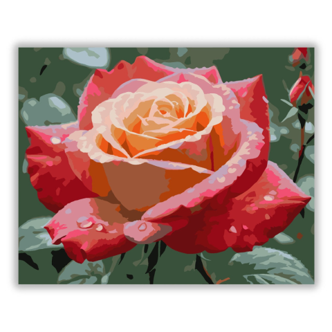 Hajnali Harmat Rózsája - számfestő készlet – 40×50 cm (Keret nélkül) A festmény egy teljesen kivirágzott rózsát ábrázol, melyet reggeli harmatcseppek borítanak. A lágy zöld háttér lágyítja a kompozíciót, romantikus és természetközeli hangulatot teremtve.