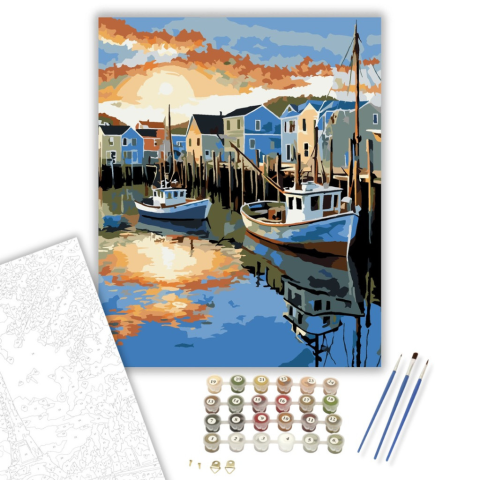 Halászhajók a Kikötőben - számfestő készlet – 40×50 cm (Keretre feszítve) A festmény halászhajókat ábrázol, amelyek csendesen pihennek egy kikötőben, napkeltekor. A házak pasztellszínei és a fölöttük köröző sirályok békés, derűs hangulatot árasztanak. A k