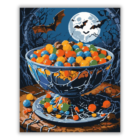 Halloween Cukorka Kavalkád - számfestő készlet – 40×50 cm (Keret nélkül) Ez a festmény egy izgalmas éjszakai jelenetet ábrázol, tele színes cukorkákkal egy átlátszó üvegtálban, melyek tükröződnek a holdfényben, miközben denevérek röpködnek a háttérben.
