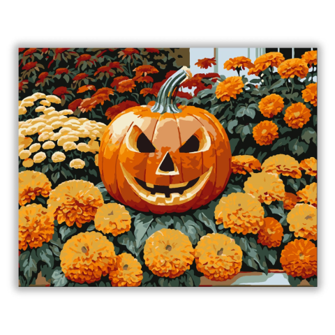 Halloween tök őszi virágokkal - számfestő készlet – 40×50 cm (Keret nélkül) Ez a festmény egy vidám Halloween tököt ábrázol, amelyet csodálatos őszi virágok vesznek körül. A narancs, sárga és piros árnyalatok vibrálása igazi őszi hangulatot teremt. A fest