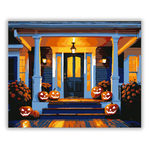 Halloweeni Este - számfestő készlet – 40×50 cm (Keret nélkül) Ez a festmény egy meghitt Halloween estét mutat be egy otthonos verandán, ahol a lágyan világító töklámpások és az őszi virágok teremtenek barátságos hangulatot. Számfestő készlet – Hallowee