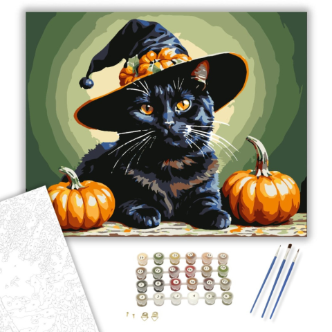 Halloweeni Macska Mágus - számfestő készlet – 40×50 cm (Keretre feszítve) Ez a bájos számfestő készlet egy csillogó szemű fekete macskát ábrázol boszorkánysüvegben, körbevéve Halloweeni tökökkel, amely tökéletes kiegészítője lehet bármely Halloweeni dekor