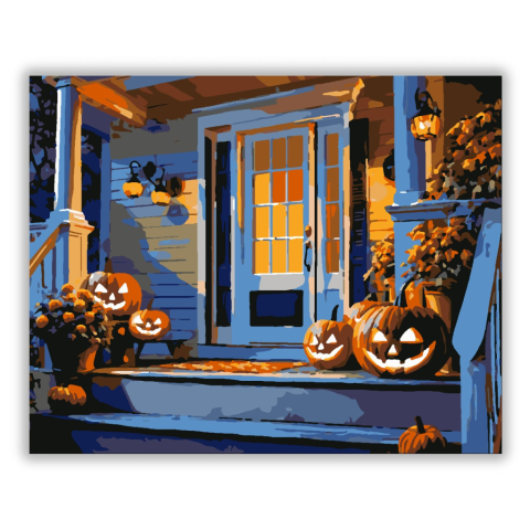Halloweeni Veranda - számfestő készlet – 40×50 cm (Keret nélkül) Ez a festmény egy hangulatos, őszi verandát ábrázol, ahol több kifaragott töklámpás világít. Az ajtó melletti világító lámpások és az őszi növények tökéletes háttérként szolgálnak a Hallowee