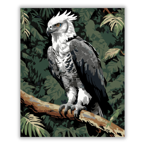 Harpia a Dzsungel Ágain - számfestő készlet – 40×50 cm (Keret nélkül) A festmény egy harpy sas ábrázol, amint egy vastag dzsungelágon pihen. A kép fekete-fehér tollazata kontrasztban áll a zöld lombozattal, kiemelve a madár tekintélyes megjelenését. A kép