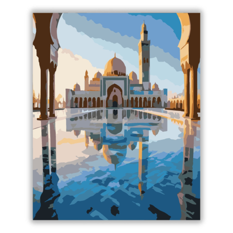 Hassan II mecset naplementében - számfestő készlet – 40×50 cm (Keret nélkül) A festmény a casablancai Hassan II mecsetet ábrázolja naplementében, minaretje visszatükröződik az óceán vizén és a márványudvaron. A kék és arany árnyalatok elegáns, nyugodt han