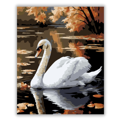 Hattyú az Őszi Tavon - számfestő készlet – 40×50 cm (Keret nélkül) A festmény egy hattyút ábrázol, amint elegánsan íveli nyakát, miközben puha, fehér tollait tisztogatja egy őszi levelekkel borított tó felszínén. A kép meleg, arany és barna árnyalatokkal