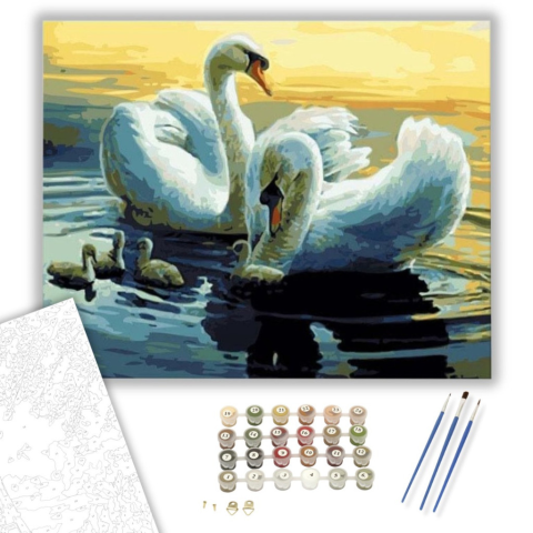 Hattyúcsalád - számfestő készlet – 40×50 cm (Keretre feszítve) A kép nyugodt harmóniát áraszt, ahogy a hattyúk családja békésen úszik a vízen. Egy történet bontakozik ki a néző előtt, ahol az élet szépsége és egyszerűsége találkozik. A meleg sárga és hűvö