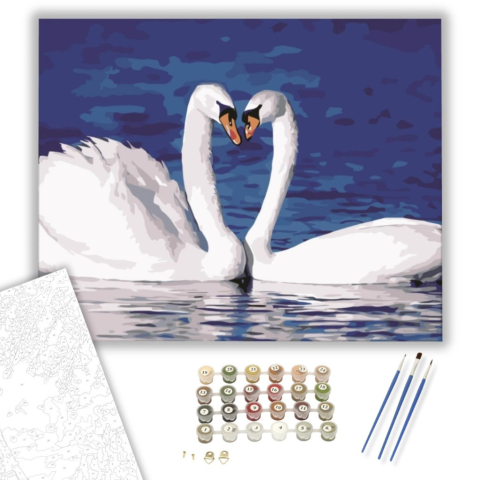 Hattyúk - számfestő készlet – 40×50 cm (Keretre feszítve) A festmény békés harmóniát sugároz, ahogy a hattyúk egymás felé hajolnak. Egy csendes tóparti pillanatot idéz, ahol minden mozdulat az intimitásról mesél. A mély kék háttér kiemeli a hattyúk tiszta