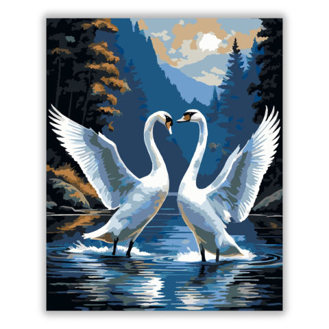 Hattyúk Tánca a Hegyi Tavon - számfestő készlet – 40×50 cm (Keret nélkül) A festmény két hattyút ábrázol, amint szárnyaikat kitárva állnak a vízen, a hegyekkel és fenyvesekkel körülvett tavon. A kék és narancs árnyalatok harmonikus kontrasztot teremtenek,