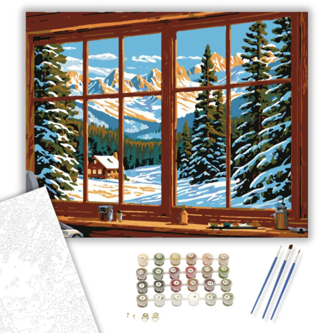 Havas Belső Nyugalom - számfestő készlet – 40×50 cm (Keretre feszítve) Az ablak előtt egy varázslatos téli tájon keresztültekintve, a képen egy magányos faház áll a hóborította hegyek között. A nap sugarai aranyló fénybe vonják a távoli csúcsokat, miközbe