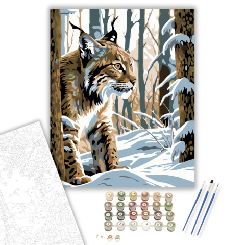 Havas Erdő Hiúza - számfestő készlet – 40×50 cm (Keretre feszítve) A festmény egy hiúzt ábrázol, amint óvatosan mozog a havas erdőben. A hideg kék és a meleg barna árnyalatok kontrasztja életre kelti a téli tájat. A kép a csendes figyelem és a természetes