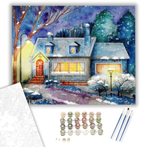 Havas ház- számfestő készlet – 40×50 cm (Keretre feszítve) Készíts gyönyörű műalkotásokat, előzetes festő tudás nélkül! Éld át az alkotás gyönyörű pillanatait és varázslatos hangulatát! Akkor is gyönyörű festményeket hozhatsz létre, ha még nem festettél v