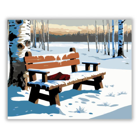 Havas Pad a Nyírfák Alatt - számfestő készlet – 40×50 cm (Keret nélkül) A festmény egy fagyos nyírfa alatti rusztikus padot ábrázol, rajta egy hóval borított pléd. A hideg fehér és kék árnyalatok kontrasztját a háttér meleg naplemente színei egészítik ki.