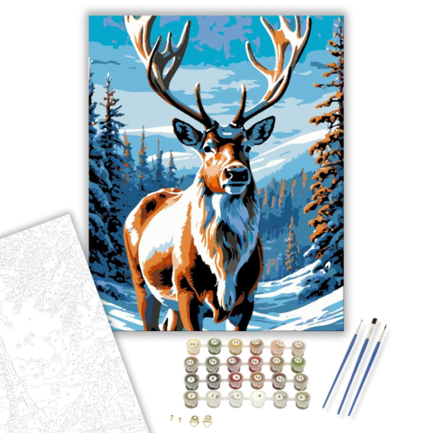 Havas Tájak Uralkodója - számfestő készlet – 40×50 cm (Keretre feszítve) A kép középpontjában egy fenséges szarvas áll, hatalmas agancsait büszkén viselve a hófödte tájban. A háttérben a zúzmarával borított fenyőerdők és a tiszta kék ég varázslatos téli a