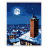 Havas Városi Tető Macskával - számfestő készlet – 40×50 cm (Keret nélkül) A festmény egy havas városi tetőt ábrázol, ahol egy macska kémény mellett pihen, miközben a csillagok ragyognak a tiszta éjszakai égen. A kék és fehér színeket a távoli város fényei