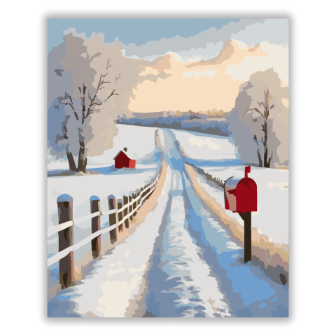 Havas Vidéki Út Postaládával - számfestő készlet – 40×50 cm (Keret nélkül) A festmény egy békés vidéki utat ábrázol, amely hóval borított mezők között kanyarog, egy magányos piros postaládával a kerítés mellett. A hideg fehér és kék színek kontrasztját a