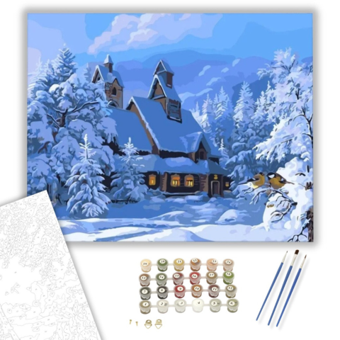 1 kép Számfestő.hu Házikó a havas tájban - számfestő készlet – 40×50 cm (Keretre feszítve)