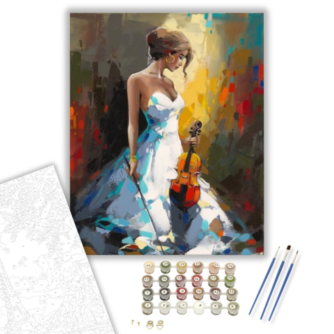 Hegedűs lány - számfestő készlet – 40×50 cm (Keretre feszítve) Készíts gyönyörű műalkotásokat, előzetes festő tudás nélkül! Éld át az alkotás gyönyörű pillanatait és varázslatos hangulatát! Akkor is gyönyörű festményeket hozhatsz létre, ha még nem festett